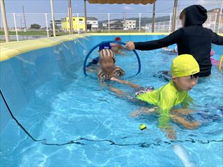 プールだけでなく、水遊び、氷遊び、水風船などたくさんの夏の遊びを楽しみました。 |