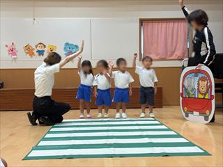幼児クラス(年少、年中、年長)のお友達が交通安全教室に参加しました。 信号を見ながら、横断歩道を渡る練習も行いました。 |