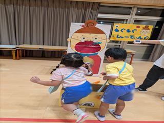 おまつりでは、スーパーボールすくい、射的、もぐもぐシューティング、コロコロバイキング、わなげの夜店があり、夜店を回ったあとは、スタンプを押してもらいました。 |