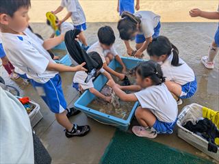 年長クラスのお友達は、どろんこ遊びをした後、着ていた服を自分たちで洗いました。 プールは8月末で終了しましたが、まだまだ暑い日が続きますので、引き続き夏の遊びも行っていきたいと思います。 |