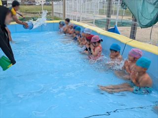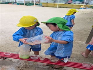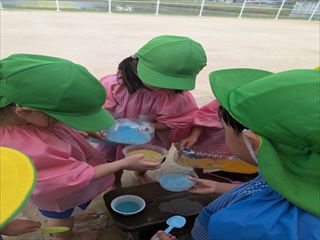色水遊び 年少クラス | 何色のジュースつくろうかな | プール 水がかかっても平気な5歳児さんです☆ |