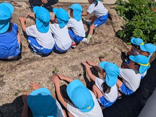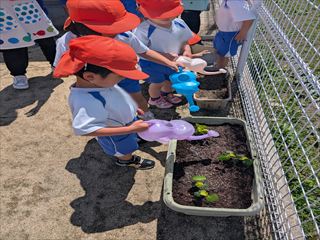 年少、年中、年長クラスの子どもたちが夏野菜を植えました。 年少さんは、ミニトマト。 年中さんはオクラ、あさがお、ひまわり。 年長さんはなす、きゅうり、さつまいも、枝豆と胡麻も植えました。 収穫が楽しみです。 |