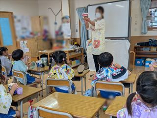 保健センターの方に来ていただき、ブラッシング指導を行っていただきました。 3歳児、4歳児クラスさんは歯磨きの大切さや、歯ブラシの使い方をパネルシアターでわかりやすく教えてもらいました。 5歳児さんは染めだし体験も行いました。 歯がピンク色になっているのを鏡で見ながら、丁寧に磨いていました。 |