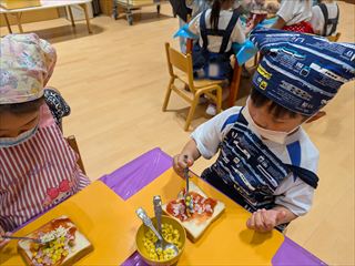 ピザトーストを作りました! ピーマン、ベーコン、コーン、そしてチーズを自分の好きなだけたっぷりとのせて完成! 皆ぺろりと食べてしまいましたよ~☺ |