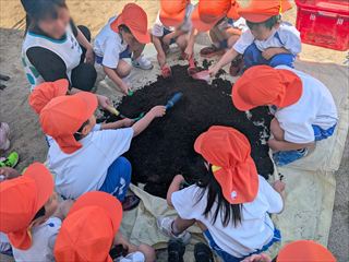 プランターに入れる土の準備をします。 | お当番さんが水やり担当です。 | 年長さんは畑に野菜を植えます。 |