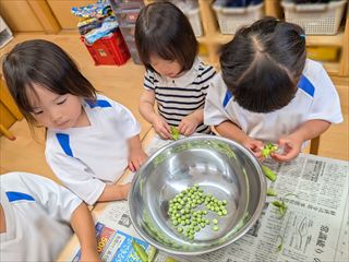 給食にえんどう豆ごはんがでるので、4歳児クラスと5歳児クラスのお友達が豆むきをしてくれました。