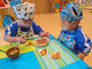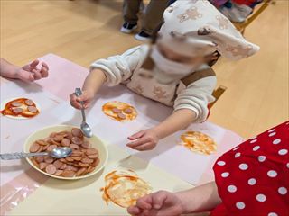 | 幼児クラスのお友達は、ご飯に目や口、角をトッピングして、赤鬼ライスを作りました。 |